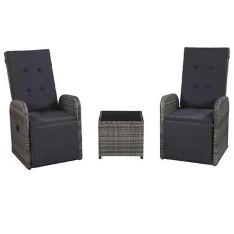 Dankzij de verstelbare rugleuning en voetensteun van de stoelen kan je comfortabel achterover leunen en volledig ontspannen. De tuinmeubelset is gemaakt van weerbestendig PE rattan en is gemakkelijk te reinigen, slijtvast en geschikt voor dagelijks gebruik. Het gepoedercoat stalen frame maakt de armstoelen en tafel zeer stevig en duurzaam. De tafel heeft een glazen blad. De verstelbare stoelen bieden alle nodige comfort. De rugleuning kantelt door aan de knop aan de zijkant te trekken. Dankzij de lichtgewicht constructie is de meubelset gemakkelijk te verplaatsen. Deze set wordt geleverd met zeer comfortabele, dik gevoerde zitkussens voor het ultieme comfort. De onderhoudsarme polyester hoezen kunnen verwijderd en gewassen worden.