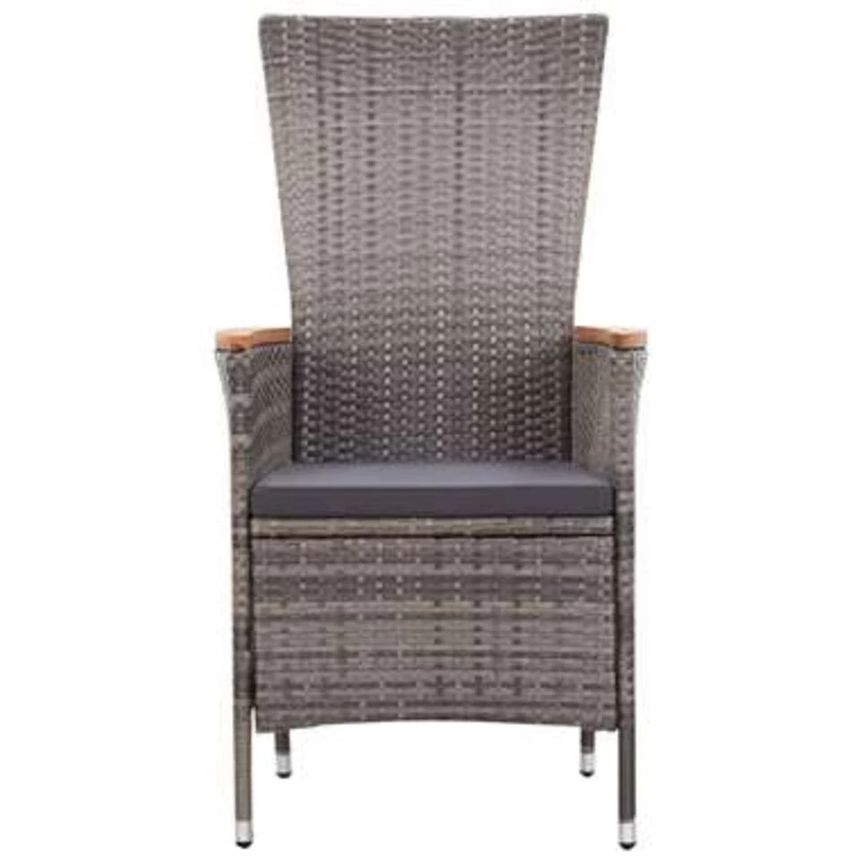 - Materiaal: PE rattan, acaciahouten tafelblad en armsteunen, en gepoedercoat stalen frame