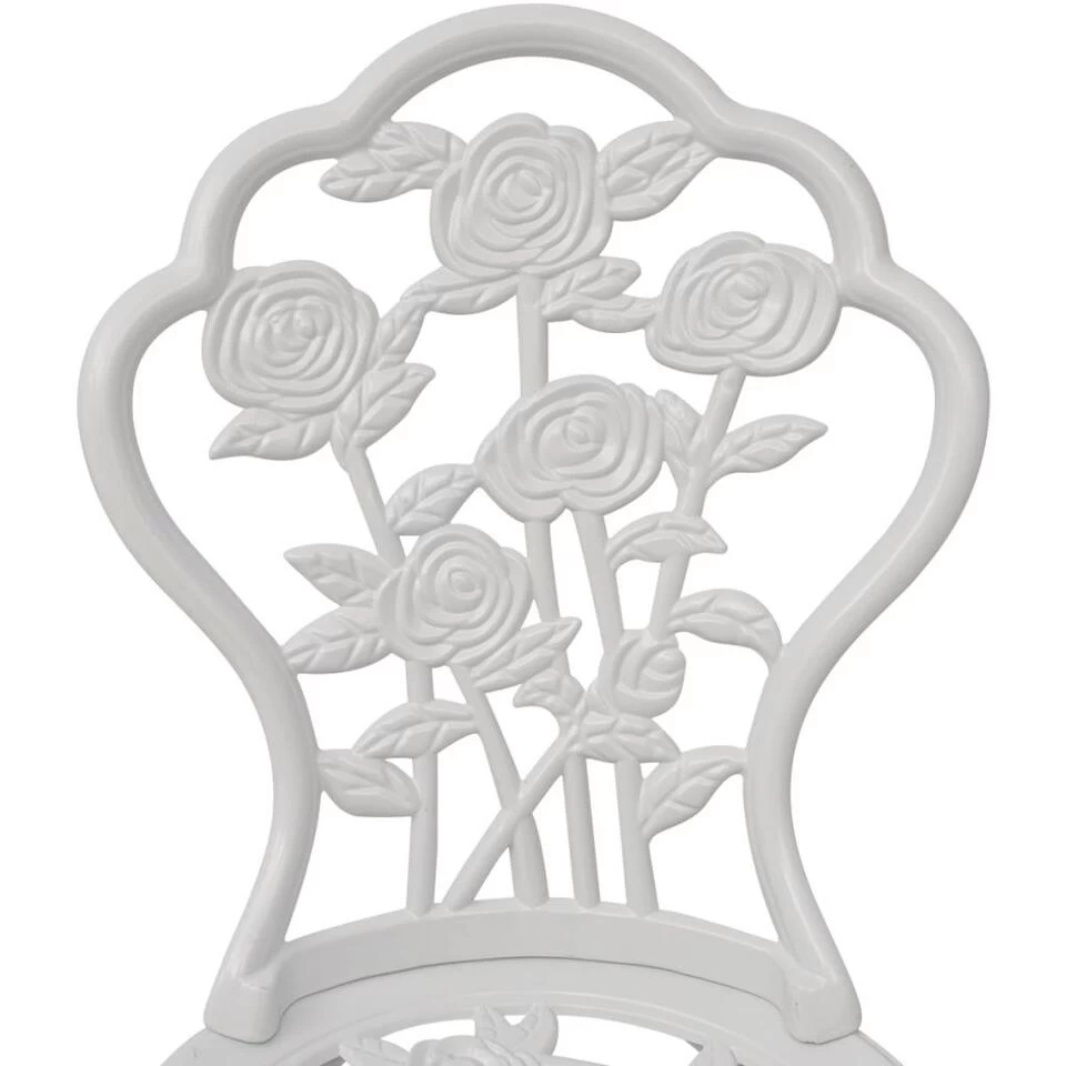 De bistroset is gemaakt van hoogwaardig gegoten aluminium, is weerbestendig en zeer duurzaam. De gietijzeren poten dragen bij aan de stevigheid van de set. Het gedetailleerde bloemenpatroon voegt een vleugje romantiek toe aan elke tuin, patio of serre.