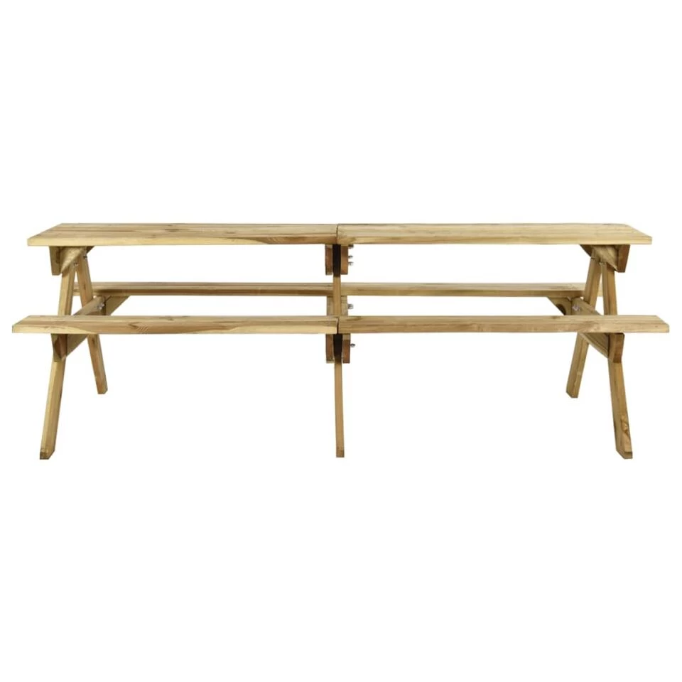Deze tafel bestaat uit 1 groot tafelblad en 2 comfortabele bankjes. De tuinpicknicktafel is gemaakt van geïmpregneerd grenenhout en wordt gekenmerkt door zijn duurzaamheid en weersbestendigheid.