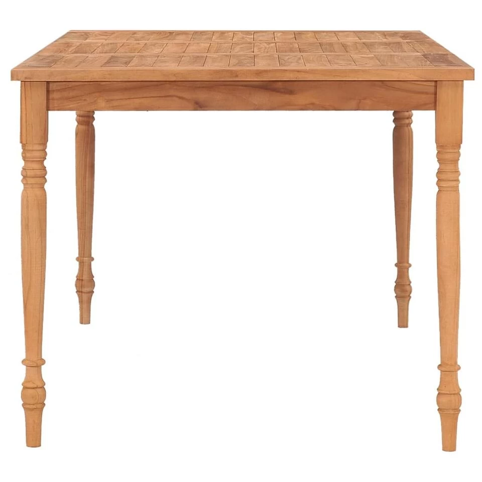 Deze set meubels is gemaakt van extreem duurzaam teakhout en is gehard, in de oven gedroogd en vervolgens fijn geschuurd om hem een zeer glad uiterlijk te geven. Teakhout staat bekend om zijn uitzonderlijke kracht en weerbestendigheid, waardoor het veel geschikter is voor tuinmeubelen dan welke andere houtsoort dan ook. Teakhout is daarom de perfecte keuze als je een duurzaam tuinmeubel wilt kopen. Dankzij het fijn geschuurde oppervlak is de eettafel weerbestendig en makkelijk schoon te maken, waardoor hij geschikt is voor binnen- en buitengebruik. Bovendien kan het houten tafelblad worden gebruikt om etenswaren, drankjes of andere decoratieve voorwerpen op te plaatsen.